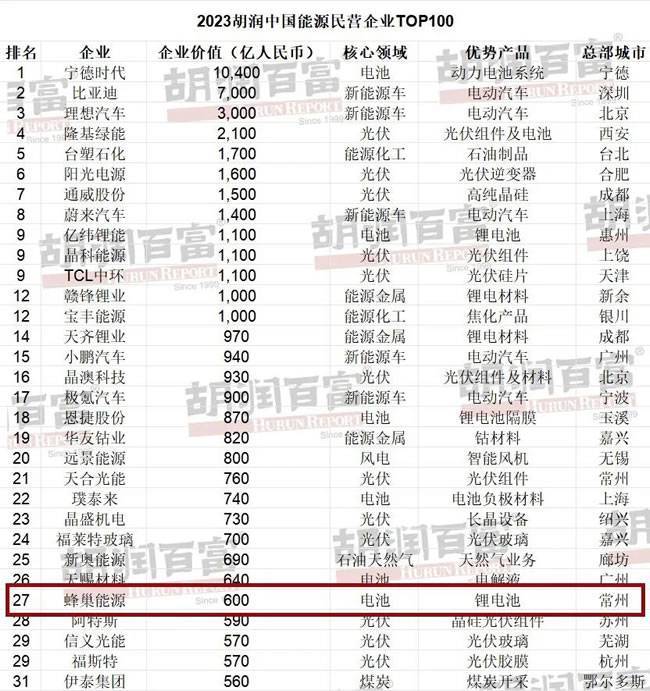 9月7日,胡润研究院首次发布了《2023胡润中国能源民营企业TOP100》,列出了传统能源与新能源产业最具价值的中国民营企业100强,蜂巢能源位列榜单第27位。