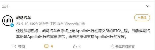 9月10日,威马汽车在其官方微博发文称,经过深思熟虑,其自愿终止与Apollo出行在港交所的RTO(反向收购上市)进程。目前威马汽车仍是Apollo出行的重要股东,未来将继续支持Apollo出行的发展。