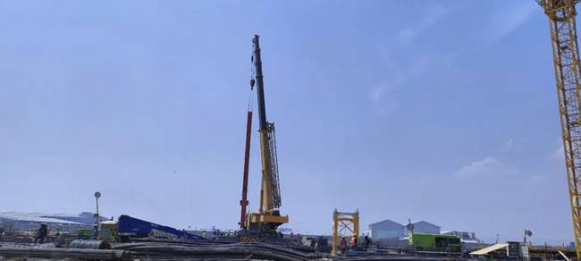在印尼锂源项目总负责人杨志宽,龙蟠集团工程中心总监高启林等领导的现场指令之下,项目首根钢柱挂钩、起吊、落位,一气呵成。第一根钢结构被精准安装到位,正式拉开了该项目钢结构安装的序幕,也标志着印尼锂源磷酸铁锂项目正式进入钢结构施工阶段。