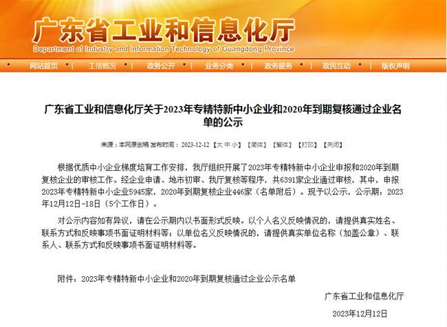 近日,广东省工业和信息化厅组织开展2023年度省专精特新中小企业认定工作已完成相关审核,正式公布通过认定的“广东省专精特新中小企业”名单。