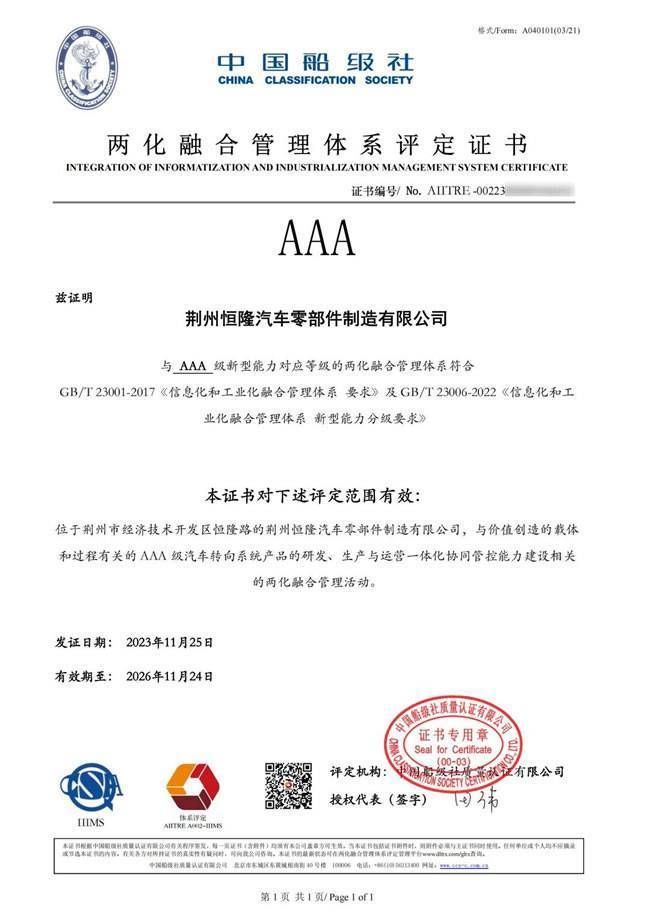 截至目前,湖北省仅有20余家企业获得两化融合管理体系AAA级评定,荆州恒隆为荆州市经开区首家通过认证的企业。