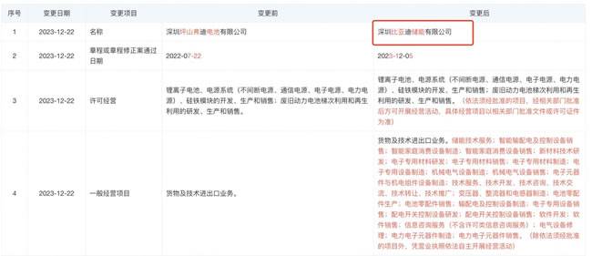 天眼查显示,12月22日,原深圳坪山弗迪电池有限公司发生工商变更,企业名称变更为深圳比亚迪储能有限公司,经营范围新增储能技术服务,智能输配电及控制设备销售,智能家庭消费设备制造、销售等。