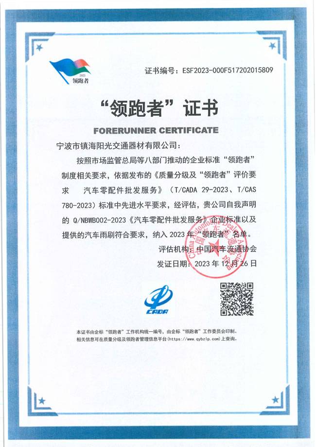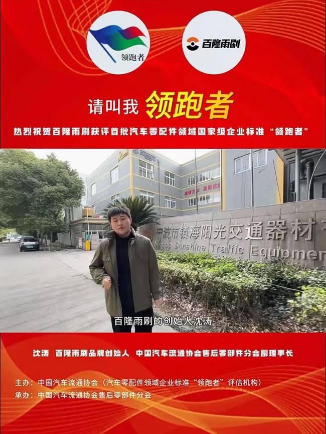 百隆雨刷工厂,宁波市镇海阳光交通器材有限公司,十分荣幸成为汽配行业首批“领跑者”企业的一员!