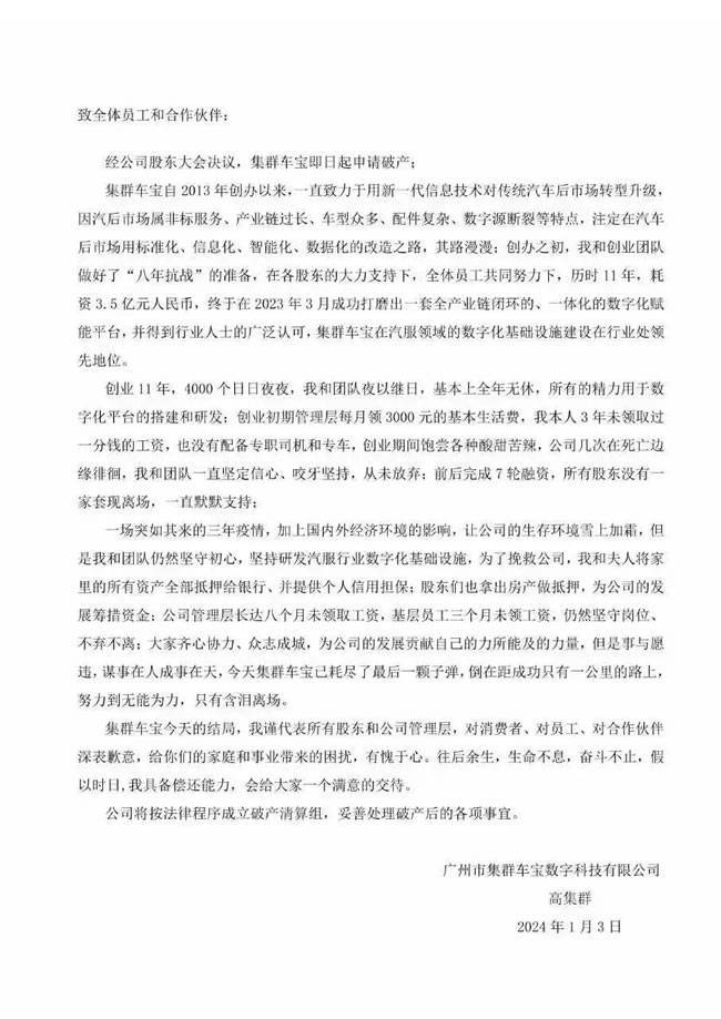 1月3日晚间,一份关于集群车宝致全体员工和合作伙伴的“通告”在朋友圈流传,记者从接近集群车宝的圈内人士处得到证实,该人士透露,即将申请破产的集群车宝负债超1亿元。