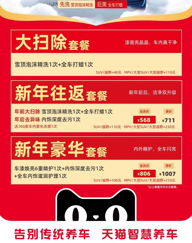 春节期间,天猫养车推出了大扫除、新年往返、新年豪华等三大阶梯套餐,场景细分,多层次满足车主个性化美容需求。