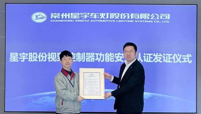 1月16日,中汽研华诚认证(天津)有限公司为常州星宇车灯股份有限公司的智能驾驶产品-视野控制器颁发了ISO 26262:2018功能安全产品认证(ASIL D)证书。星宇股份副总经理林树栋,华诚认证副总经理苑林出席了颁证仪式。