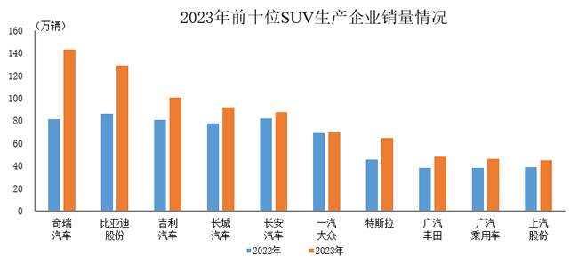 据中国汽车工业协会统计分析,2023年,销量排名前十位的SUV生产企业共销售826.5万辆,占SUV销售总量的62.6%。