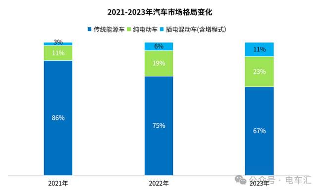 2023年中国车市传统能源车的市场份额已经降至67%,纯电动车市场份额增长至23%,插电混动车(含增程式)市场份额实现翻倍增长,达到了11%。面对这样的剧变,老牌汽车巨头终于坐不住了。