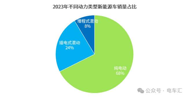 在插电式与增程式车型销量快速增长后,2023年中国新能源汽车市场已形成纯电动车占比68%、插电混动车占比24%、增程式混动车占比8%的格局,后两类车型销量增速显著高于纯电动车,并且这两类车型兼顾了“电”和“油”,正在从大众汽车这样的老牌燃油车企业中争夺客户。