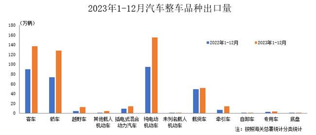 2023年,汽车整车共出口522.1万辆,同比增长57.2%;整车出口金额1016.1亿美元,同比增长68.9%。在汽车主要出口品种中,与上年同期相比,纯电动机动车、客车、轿车和载货车四大类主要出口量保持不同程度增长,其中轿车和纯电动机动车增速更为显著。1-12月,上述四大类品种共出口471.7万辆,占汽车出口总量的90.3%。