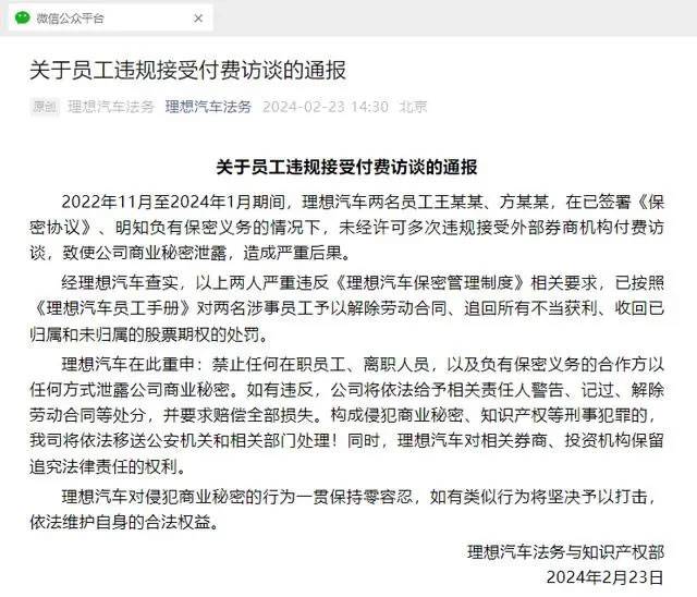 理想汽车法务与知识产权部今日发布通报:2022年11月至2024年1月期间,理想汽车两名员工王某某、方某某,在已签署《保密协议》、明知负有保密义务的情况下,未经许可多次违规接受外部券商机构付费访谈,致使公司商业秘密泄露,造成严重后果。经理想汽车查实,以上两人严重违反《理想汽车保密管理制度》相关要求,已按照《理想汽车员工手册》对两名涉事员工予以解除劳动合同、追回所有不当获利、收回已归属和未归属的股票期权的处罚。