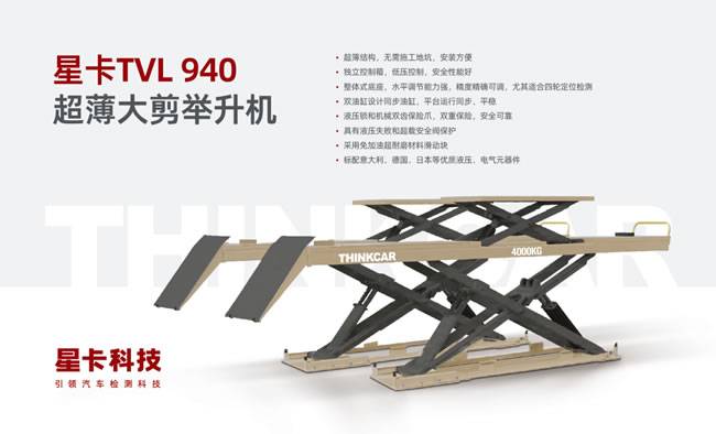 星卡TVL940超薄大剪举升机,配备了独立控制箱,低压控制,举升平台运行同步,升降平稳。剪式举升机都做了过载冗余设计,通过了120%动态装载、150%静态装载测试。采用液压锁和机械双齿保险爪双重保险,能够稳定停留在想要的高度。标配意大利、德国、日本等进口优质液压、电气元器件,具有高品质动力单元。