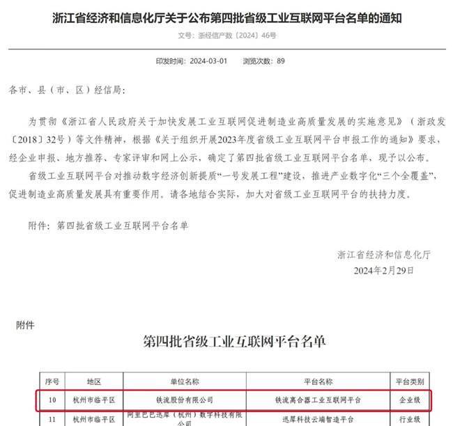 近日,根据《浙江省经济和信息化厅关于组织开展2023年度省级工业互联网平台申报工作的通知》,在企业自主申报、各设区市经信主管部门推荐、专家评审等基础上,经研究审核,确定2023年省级工业互联网平台名单,铁流股份的铁流离合器工业互联网平台成功入选。