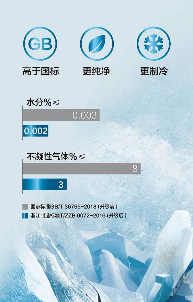 优于国家标准:水分≤0.002%,不凝性气体≤3%,均优于国家标准,防凝除冰,还原更纯净的空调环境。