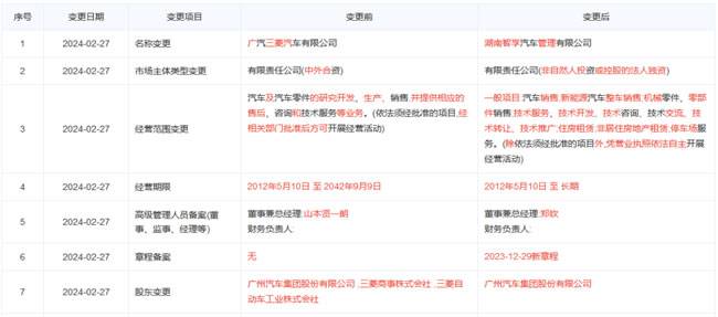 工商信息显示,广汽三菱汽车有限公司(简称广汽三菱)在2月27日完成了一系列工商变更,原股东三菱商事株式会社、三菱自动车工业株式会社全面退出,股东只剩广汽集团一家,公司名称也由广汽三菱变更为湖南智享汽车管理有限公司。这也意味着广汽三菱已正式退出中国市场。
