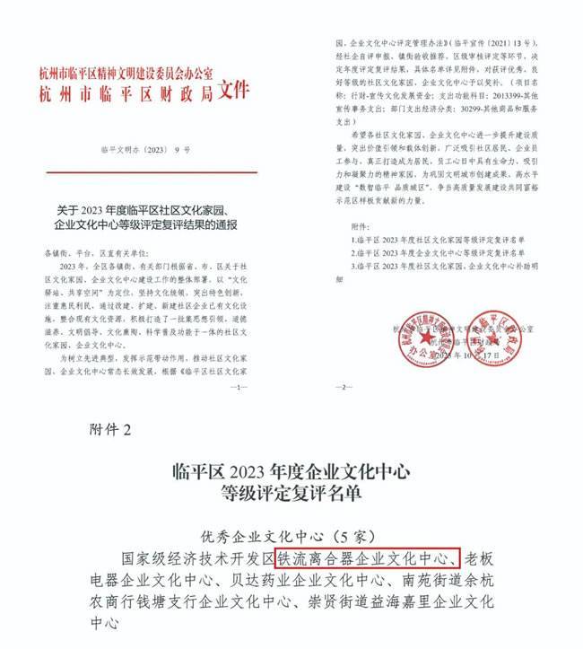 为树立先进典型,发挥示范带动作用,推动社区文化家园、企业文化中心常态长效发展,根据《临平区社区文化家园、企业文化中心评定管理办法》(临平宣传〔202113 号),经社企自评申报、镇街验收推荐、区级审核评定等环节,评定结果出炉,铁流股份企业文化中心获评临平区2023年度优秀企业文化中心。