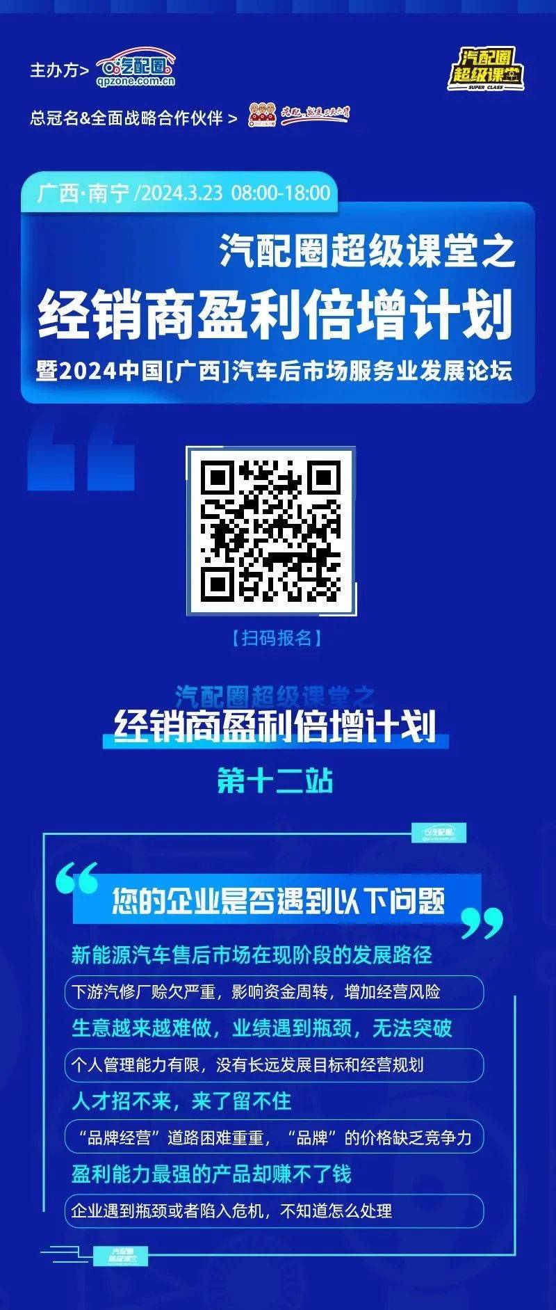 3月23日,由汽车后市场知名媒体汽配圈主办,三头六臂冠名的汽配圈超级课堂之经销商盈利倍增计划暨2024中国(广西)汽车后市场服务业发展论坛将在广西南宁拉开序幕。