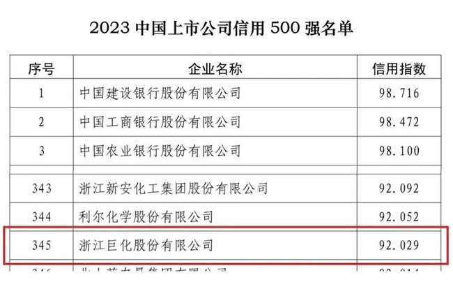 近日,中国企业改革与发展研究会、中国合作贸易企业协会发布了2023中国企业信用500强榜单,巨化股份名列345位,同时名列2023中国上市公司信用500强第322位。