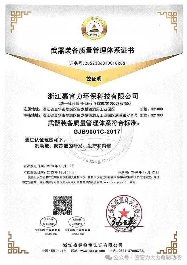 浙江嘉富力环保科技有限公司成立于2008年,是一家专业致力于汽车制动液、防冻液制造工厂。2021年通过浙江制造“品质标”认证,是浙江省《机动车辆制动液》浙江制造团体标准的起草单位。