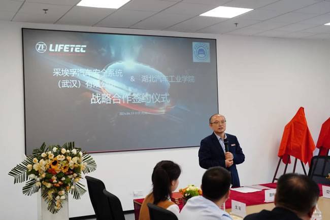 ZF LIFETEC亚太区研发总监吴征介绍了ZF LIFETEC的核心业务。他表示:“对研发来讲,人才永远是第一位的。校企合作不仅是本地化培养优秀人才的一条重要的途径,也是我们提升人才质量、创新支持和技术推动的必然要求。校企合作既让学生接触到更丰富的实践机会,增加对安全汽车零件的了解和掌握,也可以更好地利用学校的生态资源,实现双赢的合作目标,达成共同探索建立产学研用一体化的人才培养模式的愿景,共筑生命安全技术,共赢美好未来。”