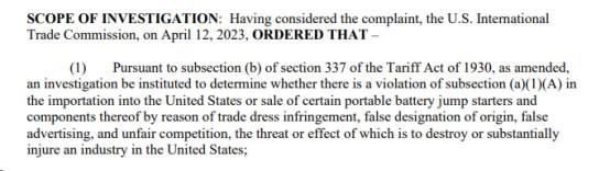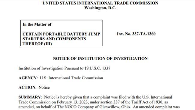 4月12日,美国ITC对NOCO指控的商业外观侵权、虚假广告、不正当竞争等主张立案调查,案号337-TA-1360。