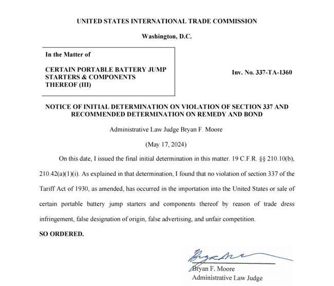 2024年5月17日,卡儿酷在与美国NOCO公司的337调查的二次案件中(案号:337-TA-1360),初裁赢得了胜利!ITC法官认作出初步裁决,认为卡儿酷等多家企业没有违反《美国1930关税法》第337条的规定。