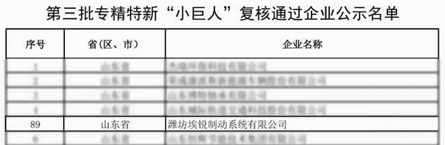 近日,山东省工业和信息化厅公布了通过复核的第三批专精特新“小巨人”企业名单,潍坊埃锐制动系统有限公司顺利通过复核!