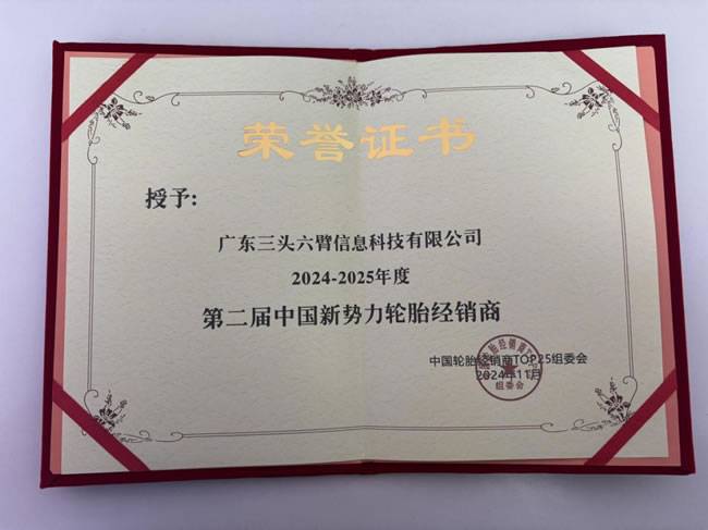 主题分享结束后,主办方公布了第二届中国轮胎经销商TOP25强名单,三头六臂荣获2024-2025年度第二届中国新势力轮胎经销商TOP25。