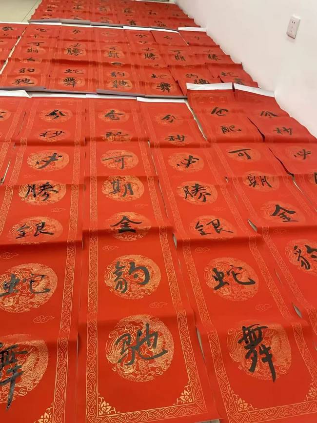 充满了新春气息的红纸铺满了桌面,一个个遒劲奔放的大字跃然纸上,若行云流水,刚柔相济,笔走龙蛇,喜庆、祝福随笔而出,一幅幅充满吉祥祝福的大红春联一气呵成,营造出欢乐、喜庆、祥和的春节氛围,增添了浓浓年味。
