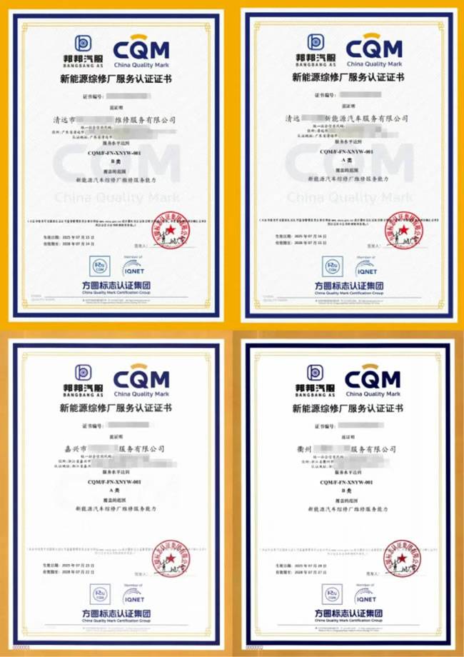 7月17日,邦邦汽服协助人保财险广东省分公司现场为2家认证综修厂颁发认证证书。目前,首批认证门店已全面完成新能源专业能力建设并投入运营,将为广大新能源承保车主提供定制化专属服务。