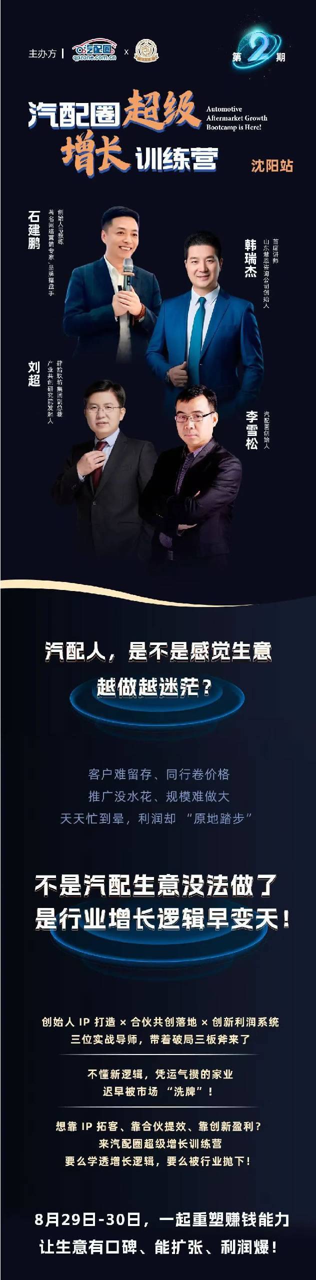 第2期汽配圈超级增长训练营·沈阳站将于 [8月29日-30日] 在 [沈阳瑞成东方饭店] 盛大开营。扫描上方流程图中的二维码即可进行报名。东北汽配市场的新一轮增长浪潮已至,抓住这次训练营的契机,为自己的事业发展探寻曙光,实现破局增长。