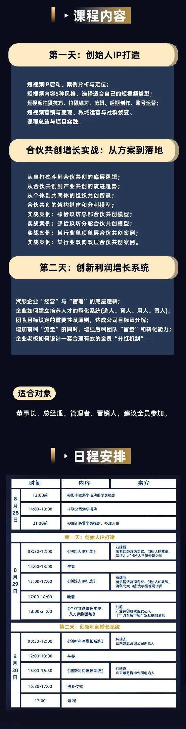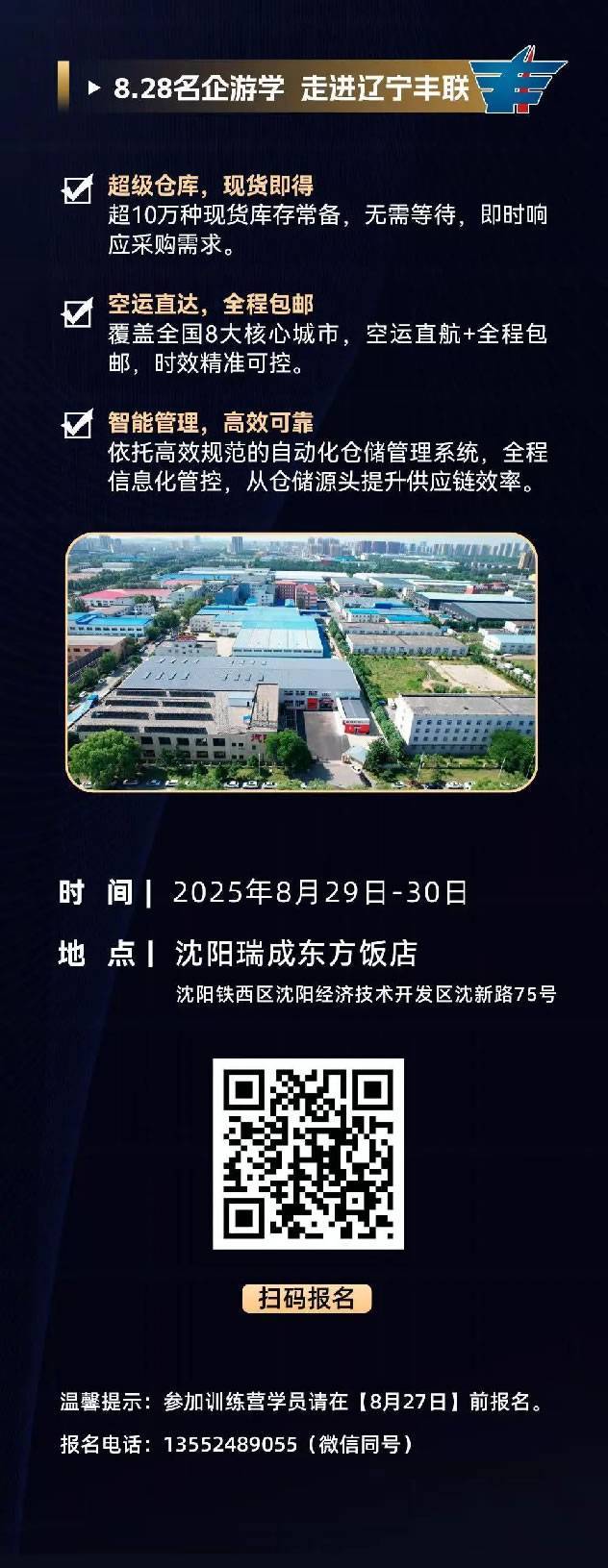 特别值得关注的是,辽宁丰联汽配为本次训练营提供了强有力的支持与保障。8月28日下午,训练营将组织学员前往辽宁丰联汽配参观交流,董事长王新宇先生也将亲自出面,迎接并接待各位学员。