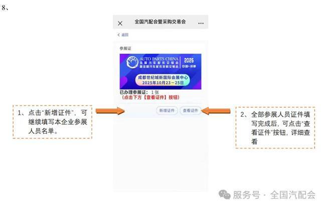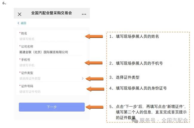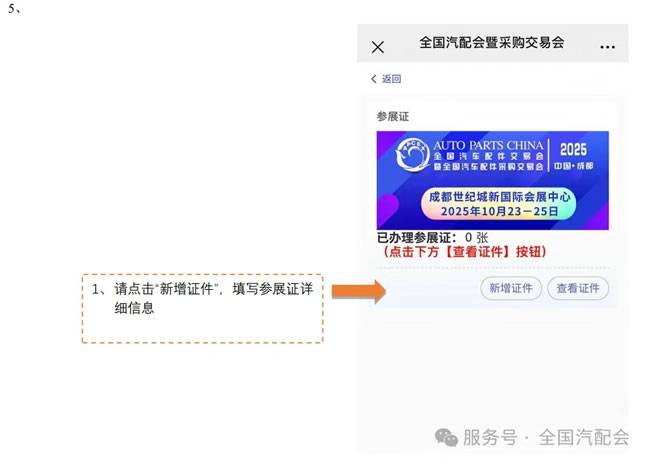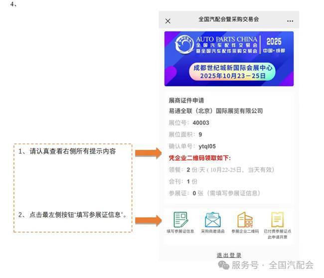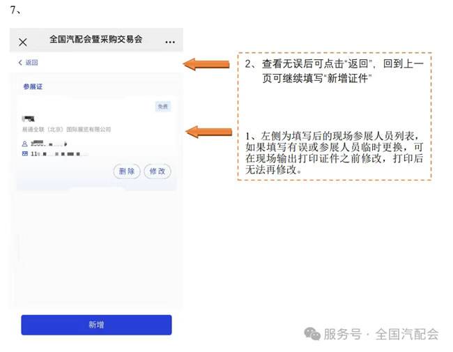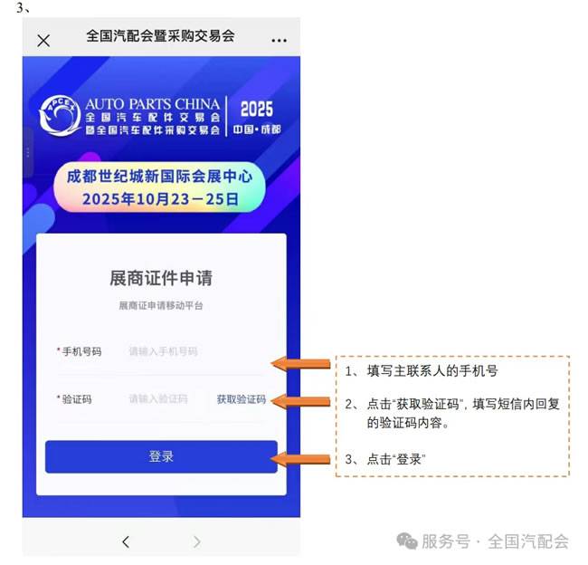 2、手机微信搜索“全国汽配会”,进入公众号选择“展商”栏目-“参展证申请”,使用合同联系人手机号登录后,填报参展人员信息。登录注册完成后系统将自动生成企业二维码。