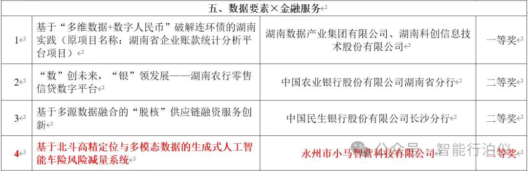 这场由湖南省数据局主办、省数据要素协会承办的省级高规格赛事,历经 4 个月筹备期、多轮材料筛选与现场路演评审,最终从 260 个晋级省级决赛的项目中,严格评选出 137 个获奖项目。其中,金融服务赛道因聚焦 “数据赋能金融业务转型” 核心目标,对方案的技术创新性、产业落地性、风险管控能力要求极高,竞争尤为激烈,一二等奖名额早早被银行、券商等实力强劲的大型国企队伍锁定。而小马团队作为唯一入围该梯队的民营企业,最终凭借 “基于北斗高精定位与多模态数据的生成式人工智能车险风险减量系统” 这一差异化创新方案,在技术应用深度、场景贴合度等维度脱颖而出,成功拿下二等奖荣誉。