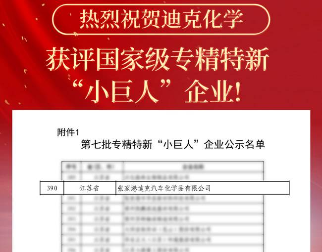 10月20日,江苏省工信厅官网发布最新一批国家级专精特新“小巨人”企业名单,张家港迪克汽车化学品有限公司荣耀上榜!