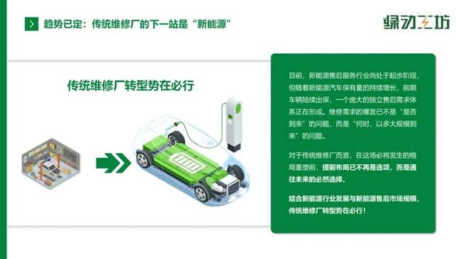 但这条转型之路并不平坦。三电系统涉及高压电气、电子控制等复杂技术,与传统机械维修差异巨大,老技师需重新学习并考取资质,培训成本高、周期长;维修人才供给不足,职业院校培养规模有限,年轻从业者对汽修行业兴趣偏低;主机厂授权服务店多集中于一二线城市,下沉市场覆盖稀疏;新能源配件品类多、车型差异大,传统修理厂采购规模小、议价能力弱,成本难以控制;加之维修设备昂贵、车主保险配套不完善等问题,让许多传统维修厂望而却步。对此,四川绿动工坊新能源科技有限公司提出了清晰的建议:转型需量力而行,不盲目跟从;优先保障生存,再谋求市场拓展;根据不同市场特点,量身定制转型方案。