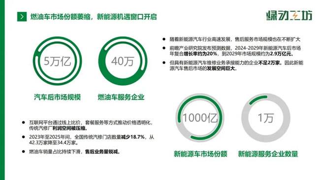 在国家“双碳”战略的引领下,汽车产业正经历一场从燃油到新能源的深刻变革,而这场变革的浪潮,不仅重塑了整车市场格局,更催生了新能源售后领域的万亿蓝海。《新能源汽车产业发展规划(2021—2035年)》《关于推动汽车后市场高质量发展的指导意见》等政策密集出台,从质量安全管理、标准体系建设到配件流通优化,为新能源售后市场搭建起坚实的政策框架,绿色低碳已不再是行业的“选择题”,而是全价值链重塑的“必答题”。