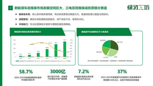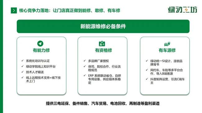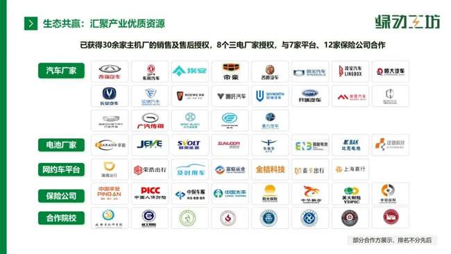 在生态整合方面,绿动工坊已获得30余家主机厂(如奇瑞、东风、荣威)的销售及售后授权、8家三电厂家授权,与滴滴、及时用车等7家平台,以及中国人保、平安等12家保险公司达成合作,并联合多所院校培养专业人才,构建起“上端资源对接+下端门店赋能”的完整产业网络。