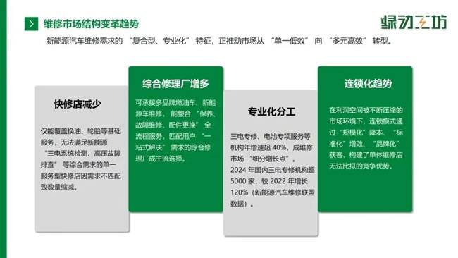 新能源维修需求的“复合型、专业化”特征,正推动维修市场结构加速变革。仅能提供换油、轮胎等基础服务的快修店,因无法满足三电检测、高压故障排查等需求,数量持续缩减;而能承接多品牌燃油车与新能源车维修、整合全流程服务的综合修理厂,逐渐成为市场主流。同时,三电专修、电池专项服务机构年增速超40%,2024年国内三电专修机构已超5000家,连锁化模式也凭借规模化降本、标准化增效的优势,逐渐取代单体门店的分散竞争格局。