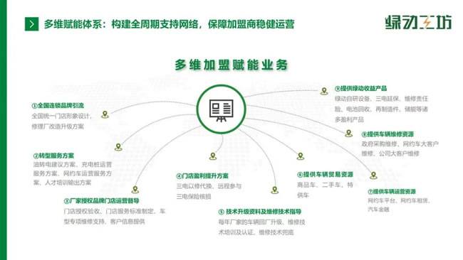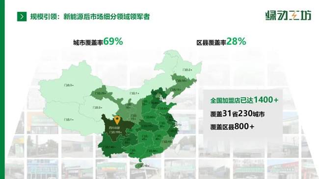 如今,绿动工坊的全国加盟门店已超1400家,覆盖31个省份、230个城市、800多个区县,城市覆盖率达69%,区县覆盖率28%,形成了全国最大的新能源专修网络。其核心竞争力源于四大驱动力:10年技术积累带来的研发优势,让企业在技术培训与设备研发上“人无我有、人有我优”;稳定的供应链体系,为加盟商提供低成本的工具、设备与零配件;多元化的盈利产品,如三电延保,助力门店提升利润;规模效应带来的品牌影响力,为门店引流赋能。