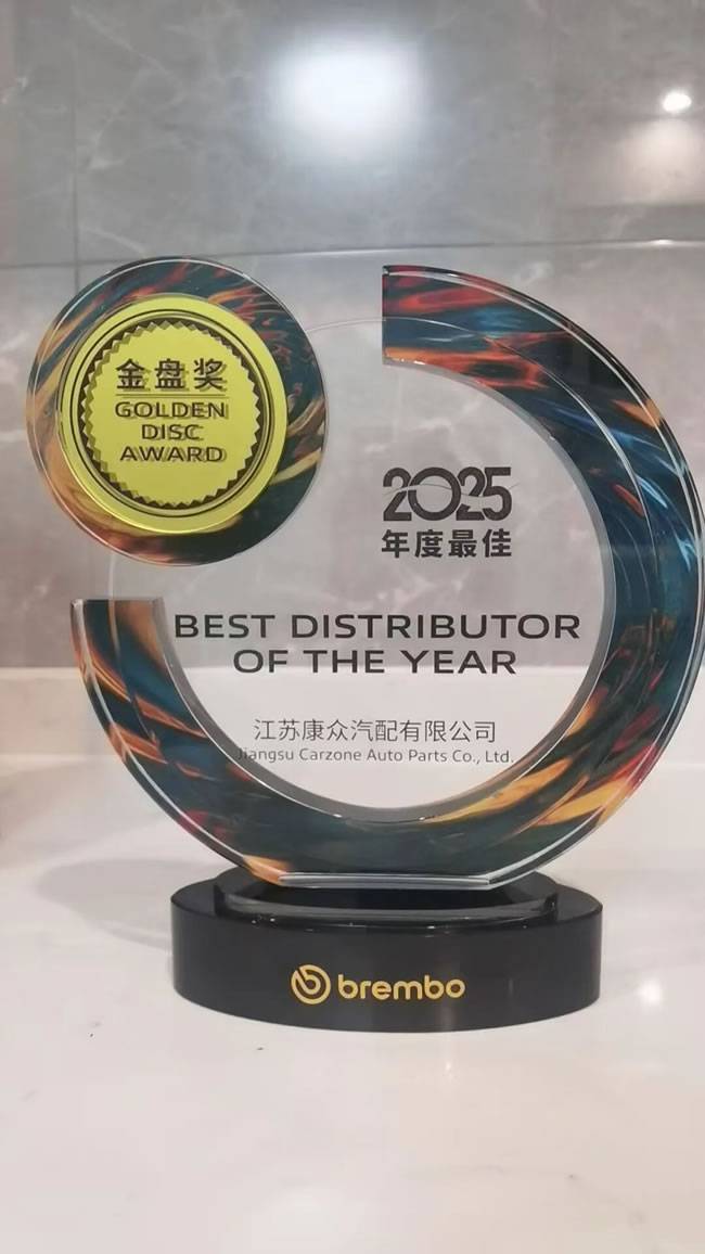 2025年11月26日,上海法兰克福国际汽配展首日,全球汽车制动系统领导者布雷博(Brembo)举办2025年度布雷博后市场中国客户答谢晚宴,来自全国各地的核心合作伙伴齐聚一堂,共话行业发展。康众受邀参会并荣获2025年度最佳经销商奖项——“金盘奖” ,这不仅是对双方这一年中合作表现的认可,也标志着双方合作迈向了新的台阶。