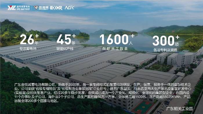 金悦诚始创于 2000 年,是集阀控式铅酸蓄电池研发、生产、销售、服务于一体的集团型企业,历经 26 年发展,已形成产业化、规模化、全球化的发展格局。公司拥有广东韶关、马来西亚两大生产基地,总生产面积超 50 万平方米,其中韶关基地 35 万平米,马来西亚基地为斥资 15 亿打造的 15 万平米现代化工厂,配套专属研发中心与实验室,构建起完善的研产体系。