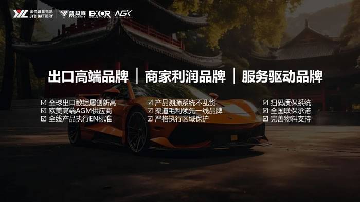 围绕国内市场发展,金悦诚确立了 “出口高端品牌、商家利润品牌、服务驱动品牌” 三大核心定位,全方位构建品牌竞争力。在产品端,金悦诚完成铅酸蓄电池全产品线、全产业链布局,不仅拥有 AGM 起停电池、EFB 起停电池、免维护蓄电池等燃油车配套产品,更针对新能源市场推出新能源辅助电池,同时布局船用电池、驻车柴发电池等细分领域,以 “不止于启停” 的全场景产品解决方案,应对新能源冲击,挖掘细分市场增量;其推出的SAE标准产品,目前仅行业龙头与金悦诚能够研发生产,依托北美 SAE 标准起步即拥有三年质保,为国内市场带来更高品质选择,大幅提升产品竞争力。