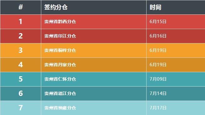 2018年6月15日——2018年7月17日,经贵州中心仓团队的积极努力与付出,获得了签署7家分仓的傲人成绩,分别先后成立了贵州省印江分仓、黔西分仓、桐梓分仓、丹寨分仓、仁怀分仓、德江分仓、纳雍分仓,为贵州市场的整体发展及聚风集团2018年战略目标都增添了浓墨重彩的一笔。