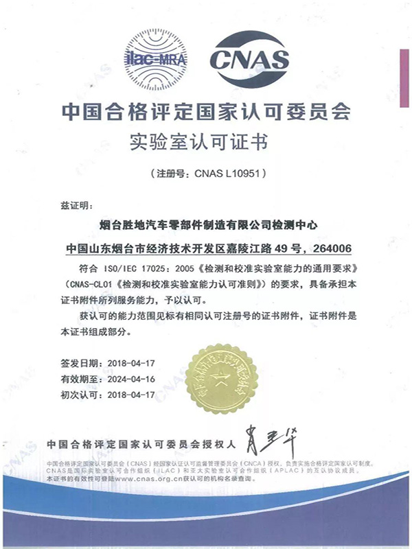 4月17日,胜地公司检测中心顺利拿到“中国合格评定国家认可委员会”颁发的CNAS认可证书,机构注册号:CNAS L10951。认可能力范围:汽车刹车盘。这也是全国制动盘行业唯一获得CNAS认证的国家实验室!