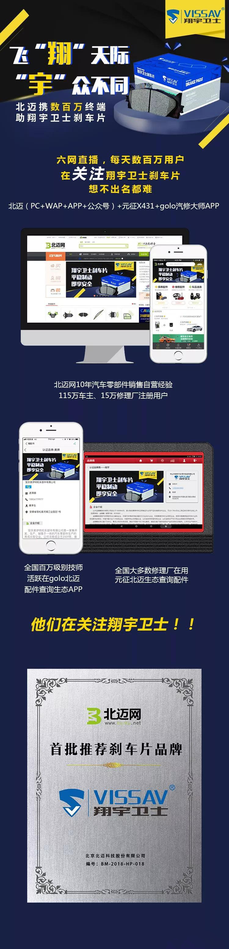 翔宇卫士荣登 “汽后央视”,只因联姻北迈科技,瞬时翔宇卫士成为数百万汽后终端用户关注的中国汽车后市场刹车片品牌。一夜成名天下知。