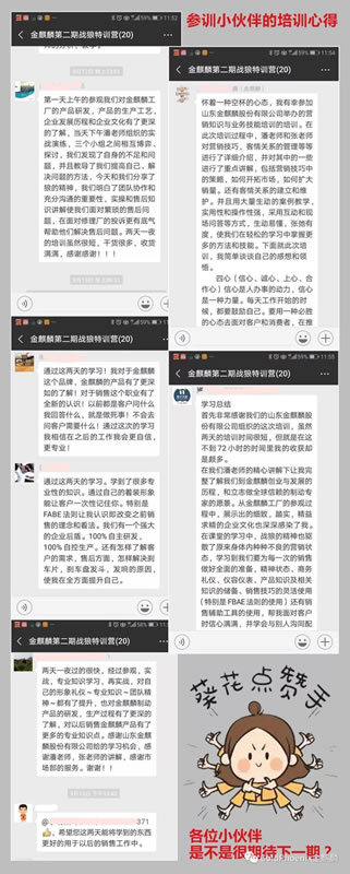 特训结束后,学员们表示收获很大,这是他们所经历最难忘的培训:培训课程接地气,贴近实战;授课方式人性化,虽然内容多,但感觉一点也不枯燥。他们表示感谢金麒麟给予的这次培训机会,在以后的工作中,一定牢记老师的教诲,取得更好的销售业绩。