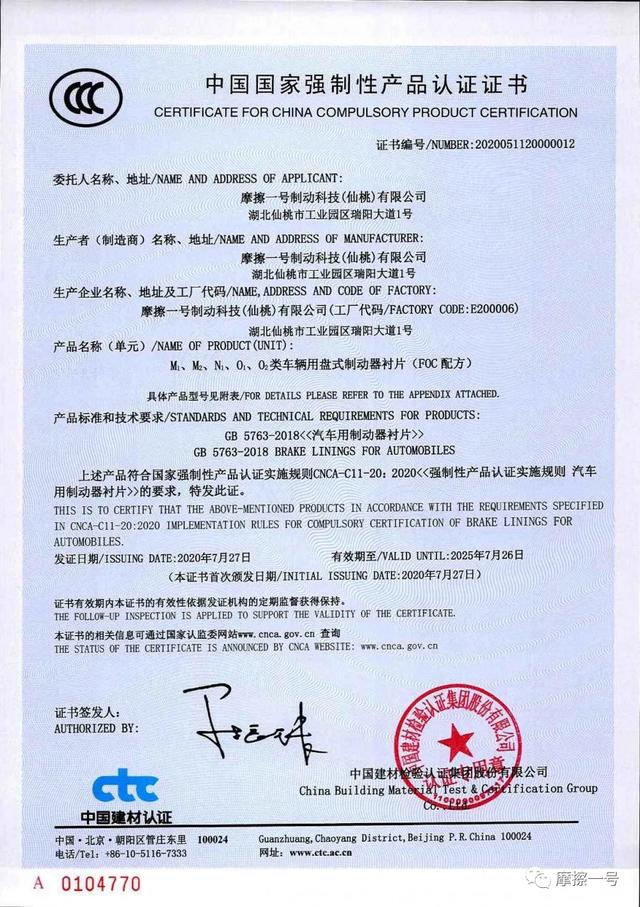 日前,中国建材检验认证集团股份有限公司(中文简称国检集团,英文简称CTC)为摩擦一号制动科技(仙桃)有限公司等共11家原持有效生产许可证的企业换发了汽车用制动器衬片产品的首批CCC证书。