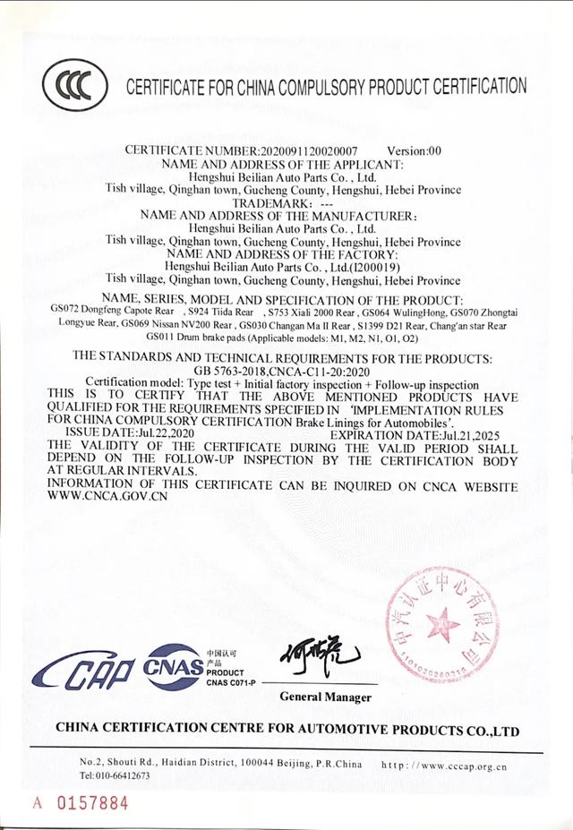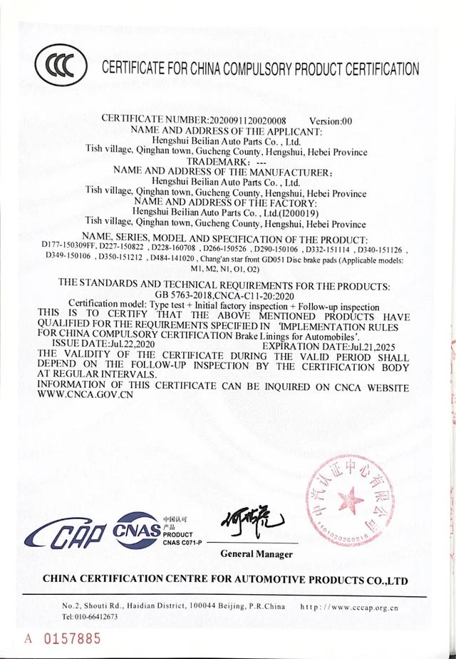 自国务院发文明确汽车用制动器衬片产品(刹车片)即将转为强制性产品认证(CCC)管理后,嘉联达刹车片为熟悉和理解CCC认证工作,委托中汽认证中心有限公司进行了专业、系统的培训。