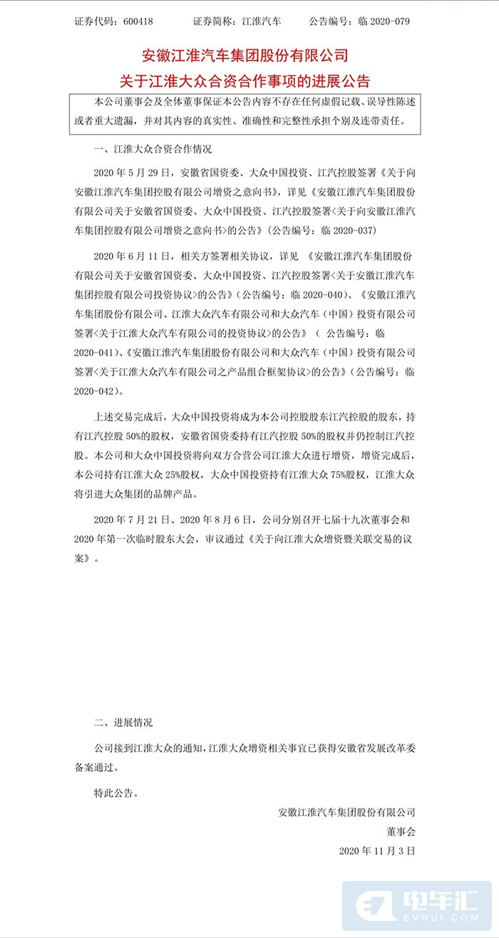 11月2日,江淮汽车发布江淮大众合资合作事项进展公告。江淮汽车称,接到江淮大众通知,江淮大众增资相关事宜已获得安徽省发展改革委备案通过。
